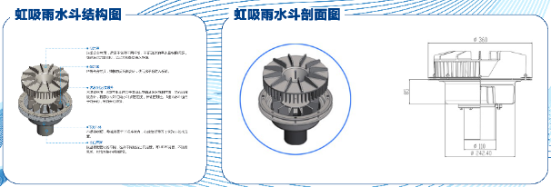 由斗體、導(dǎo)流罩、出水短管、連接壓板和整流器等組成。導(dǎo)流罩是用來攔截樹葉等固體雜物的雨水斗部件,兼有整流作用;整流器是虹吸雨水斗的重要部件,用來疏導(dǎo)水流、 消減旋流和減少空氣進入 雨水斗出水短管;虹吸雨水斗能夠在較小的斗前水深的情況下,達到滿流狀態(tài)。我們公司開發(fā)的數(shù)十種虹吸式雨水斗專利產(chǎn)品,符合《虹吸雨水斗》CJ/T245-2007 國家標(biāo)準,排水量從 6L/s~120L/s,適用于各種類型的屋面。